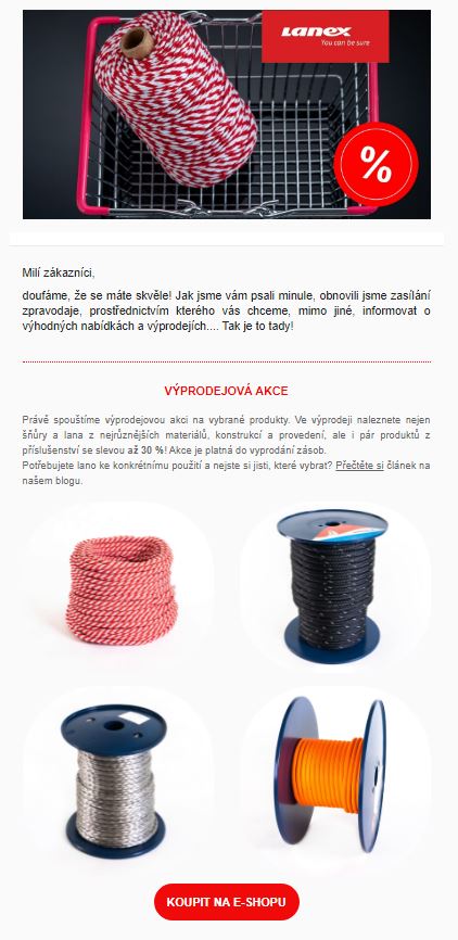 Výhodou odběru zpravodaje je, že jste včas informováni o produktových novinkách, dozvíte se užitečné informace týkající se sortimentu na e-shopu. Nemalou výhodou je také to, že příjemci zpravodaje se jako první a včas dozví informace k výprodejům, slevám a speciálním akcím. Malou ukázku takového informování vidíte zde: