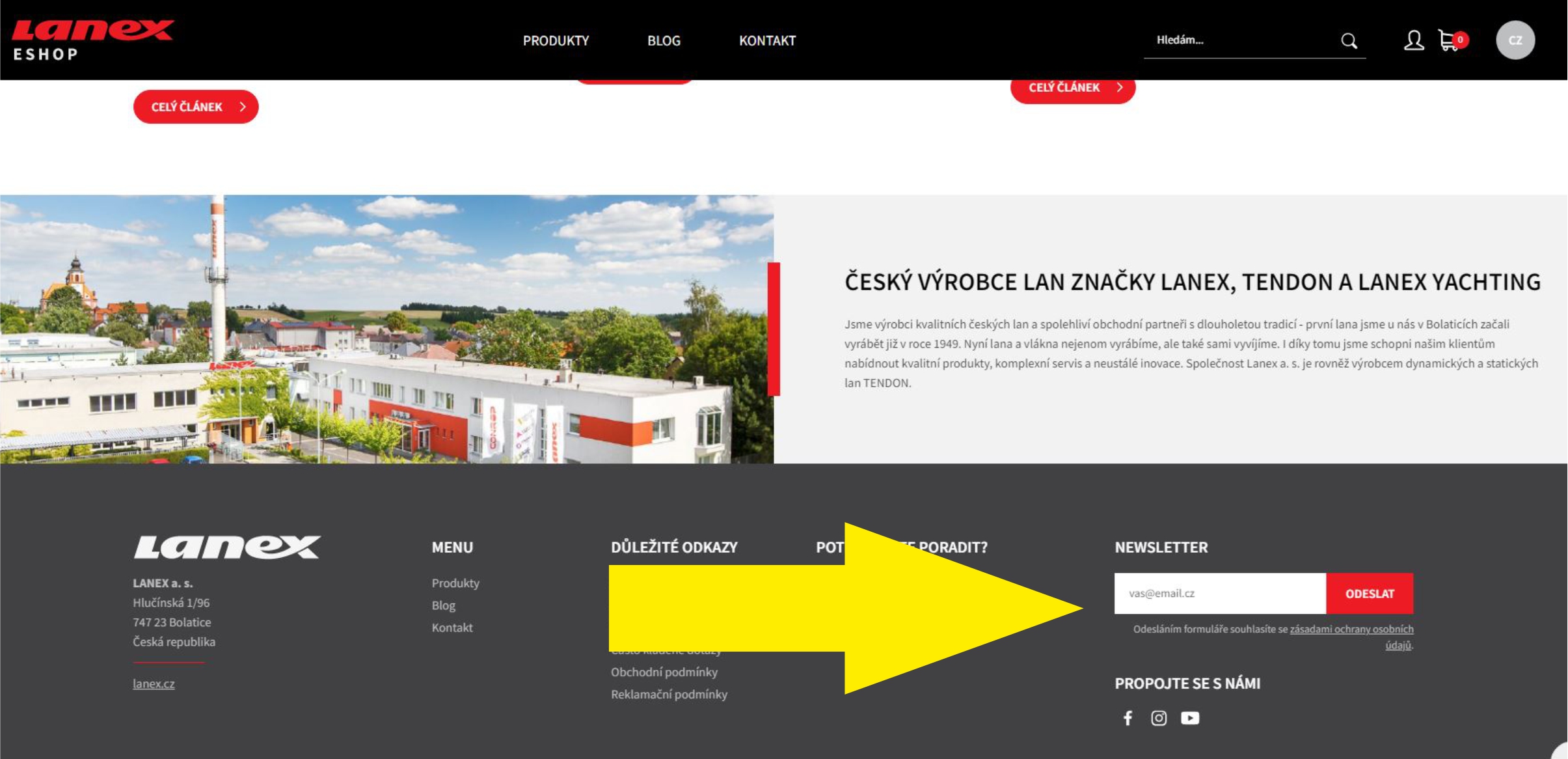 Nebo rychlý tip: v zápatí stránky (scrolujete-li úplně dolů) je bílý obdélník a nad ním nápis NESLETTER. Do tohoto obdélníku napište svou e-mailovou adresu, na kterou chcete zpravodaj dostávat a zaklikněte ODESLAT. A máte hotovo.